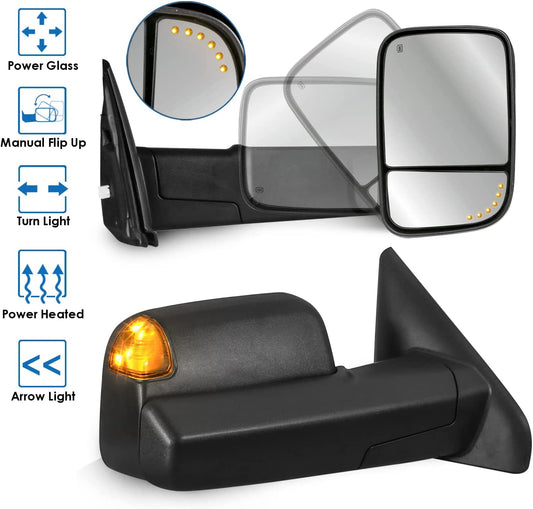 Power Heated Towing Mirrors Compatible for 02-09 Ram Flip Up Left Right Pair w/Arrow Light and Turn Signal Light (Set of 2)