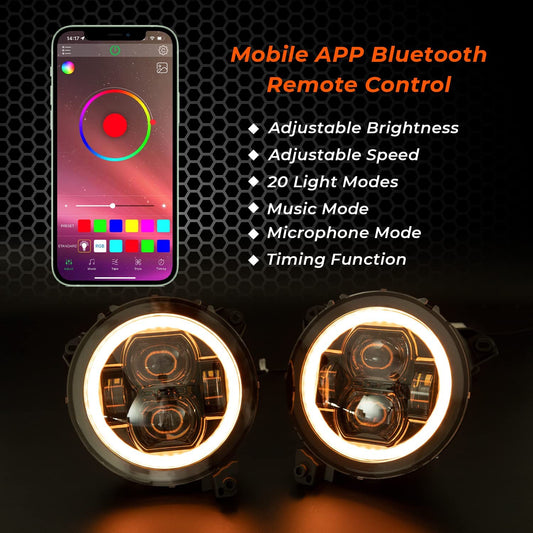 9” Inch RGB halo Headlights with Bluetooth for 2018-2023+ Wrangler JL Gladiator JT Accessories