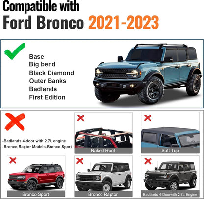 - 【Compatibility】Compatible with Ford Bronco Hard TOP 2Door & 4Door 2021 2022 2023 2024.Not fit for Except Raptor, 4Door 2.7L Badlands, Bronco Sport. Please check your vehicle's Year, Make and Model before purchase.