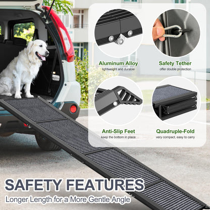 - 【 Sturdy & Lightweight Dog Car Ramp 】The large dog's pet ramp is made of high-grade aluminum which makes the folding dog ramp stairs sturdy but more lightweight, its mechanically designed structure provides strong support. The foldable dog car ladder weighs only 14 lbs but is strong enough to support up to 250 lbs, perfect for small, medium & large dogs' indoor and outdoor use when getting into a vehicle, car, SUV, truck, couch, or high be
