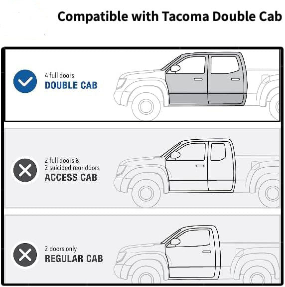 - Fitment: Compatible with 2005-2023 Tacoma Double Cab with 4 full-size doors.Please note: It is not compatible with a 2024 Tacoma.