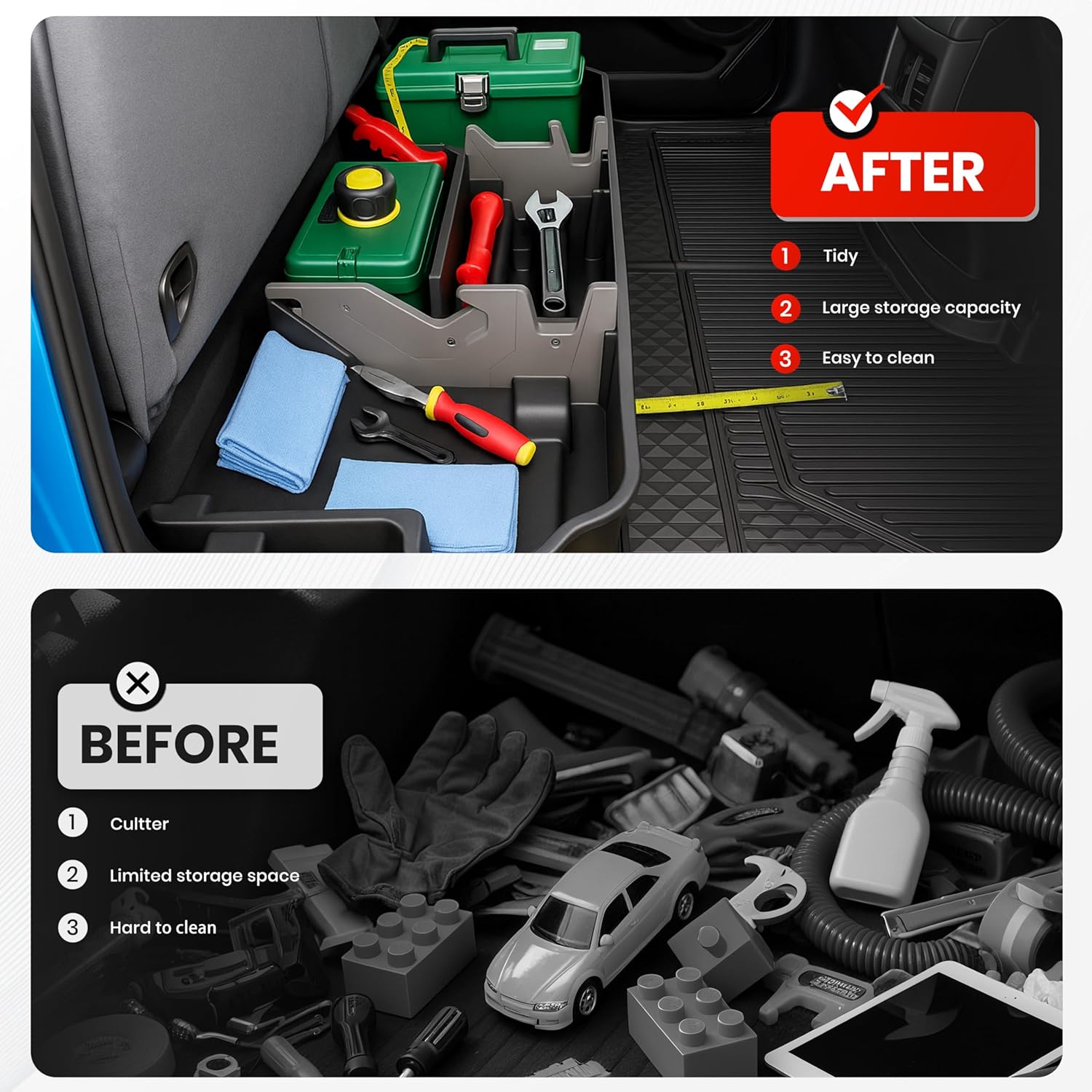 - Removable partition, flexible classification and storage: free partition, built-in adjustable partition, easy to separate items (such as screwdrivers/gloves/charging cables), easy to access at a glance. No interference with the seat, low-profile design, does not affect the seat to move back and forth or tilt after installation, more comfortable driving.