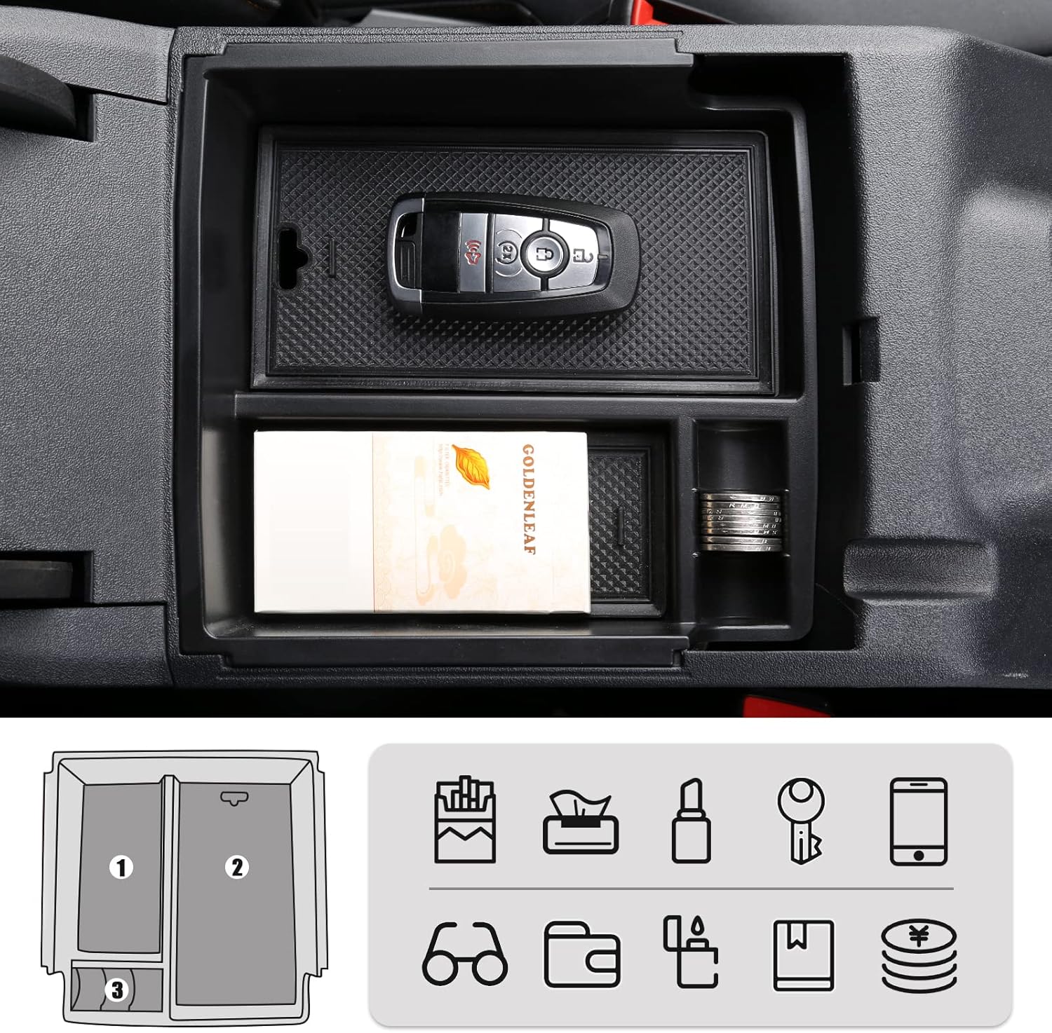 - Function: If you often cannot find the small items in the car, you must need this organizer. provide space to put your key, cell phone, charging adapters, credit card, ID Badges, and coins, etc.Provides you with quick access to commonly used items with more storage space than OEM tray