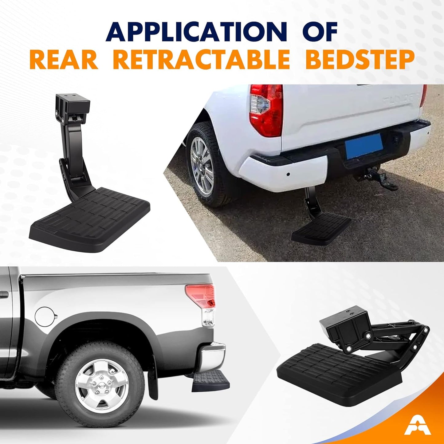 - 【High Quality】Tacoma bed step are made of reinforced, high-quality materials that are wear-resistant, corrosion-resistant, easy to clean, and long-lasting. tread surfaces for up to 300 lbs. This telescopic bed step for easy access to the truck bed and retracts back into the stored position with a gentle push to give an “out of the way” look within the bumper, and when stretched, the non-slip and high-impact pads above the steps will give you a strong support foot, allowing you to get in and out of bed easily and safely.