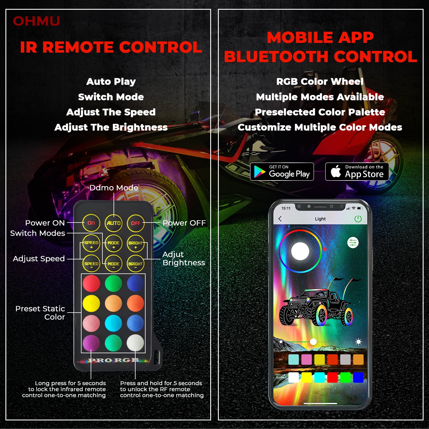 - 【Bluetooth and Remote control】Each kit has the ability to cycle through dozens of light variations and solid colors.The included RF remote controls both speed with forward and reverse sequence at the touch of a button.