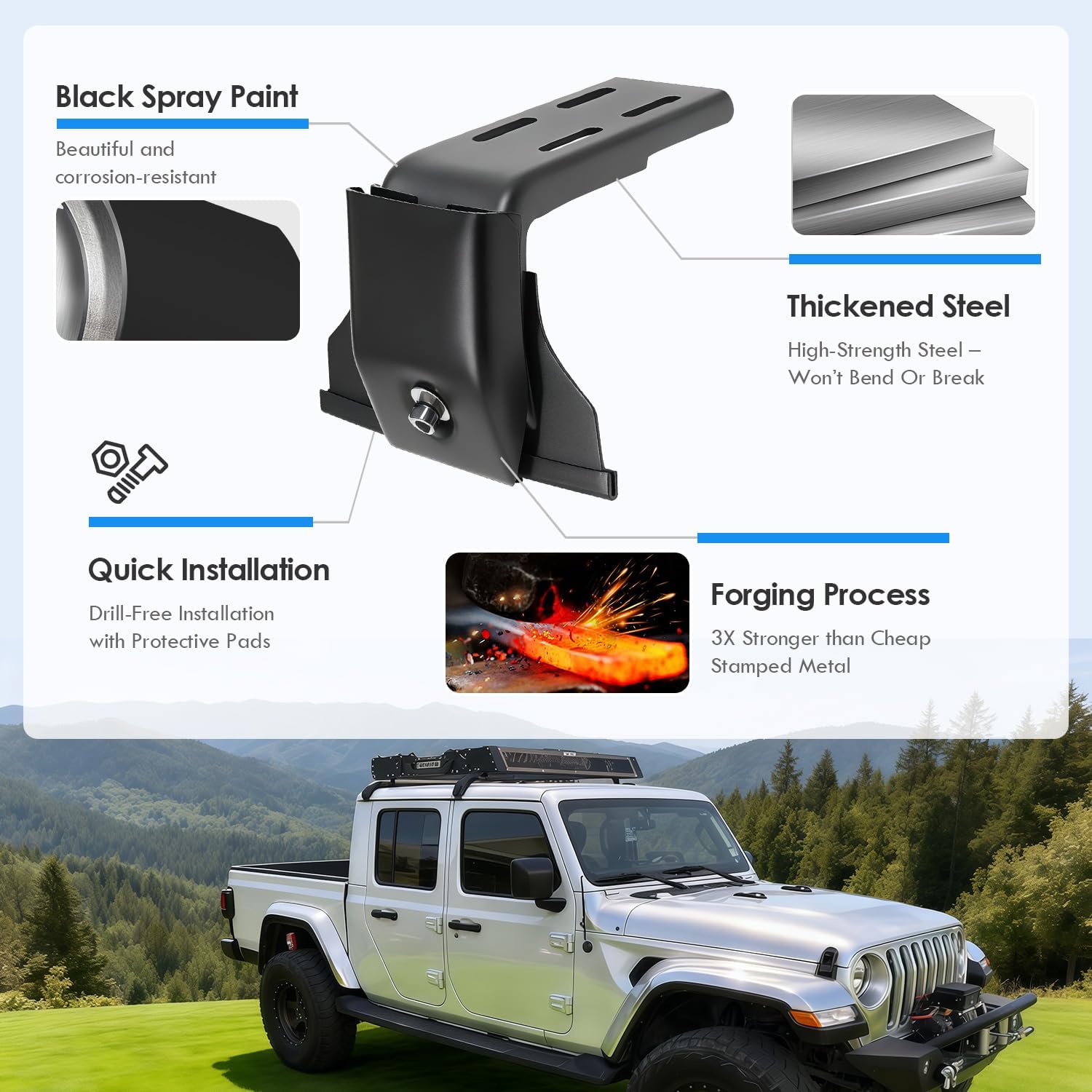 【Drill‑Free Installation with Protective Pads】Easy clamp‑on installation—no drilling required. Extra‑thick rubber pads prevent scratches and ensure a secure grip.