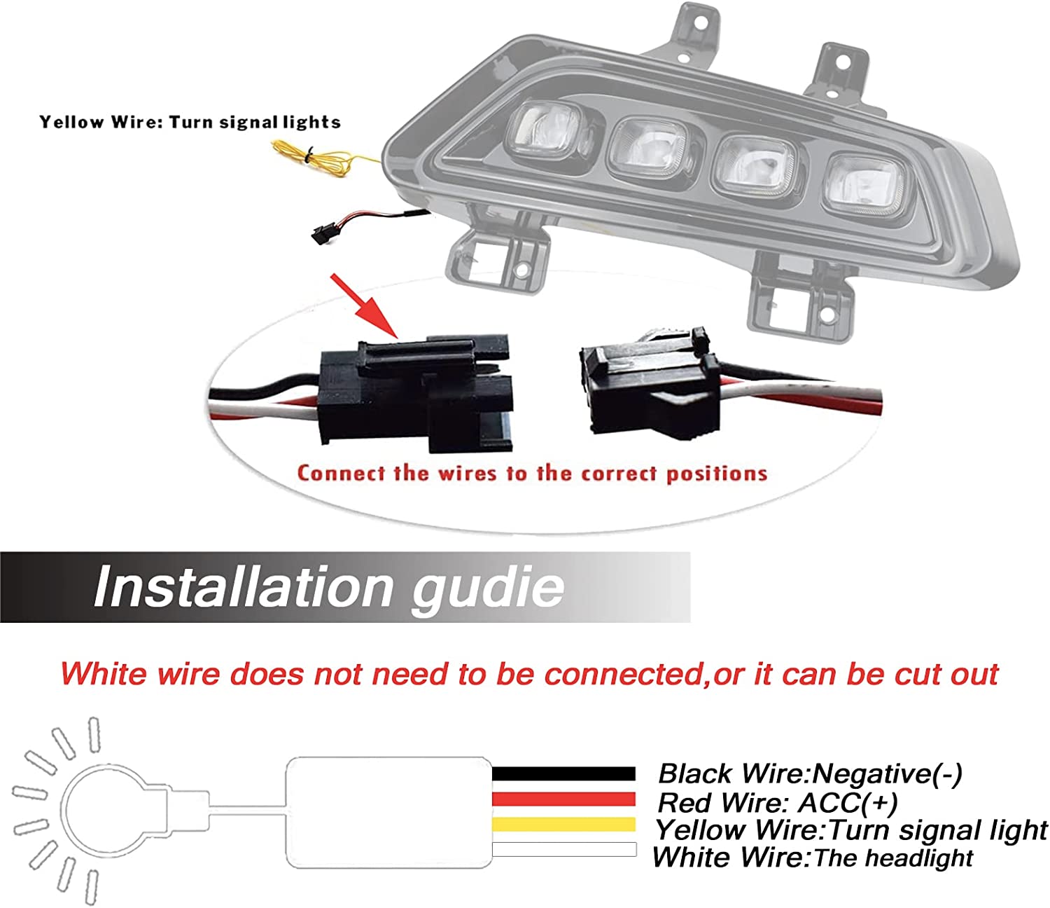 - ✤【Installation】Connect the Black wire to the negative, Red wire to the running light positive, Yellow wire to the turn signal positive ;White wire connect the Headlights Reduce the Brightness.