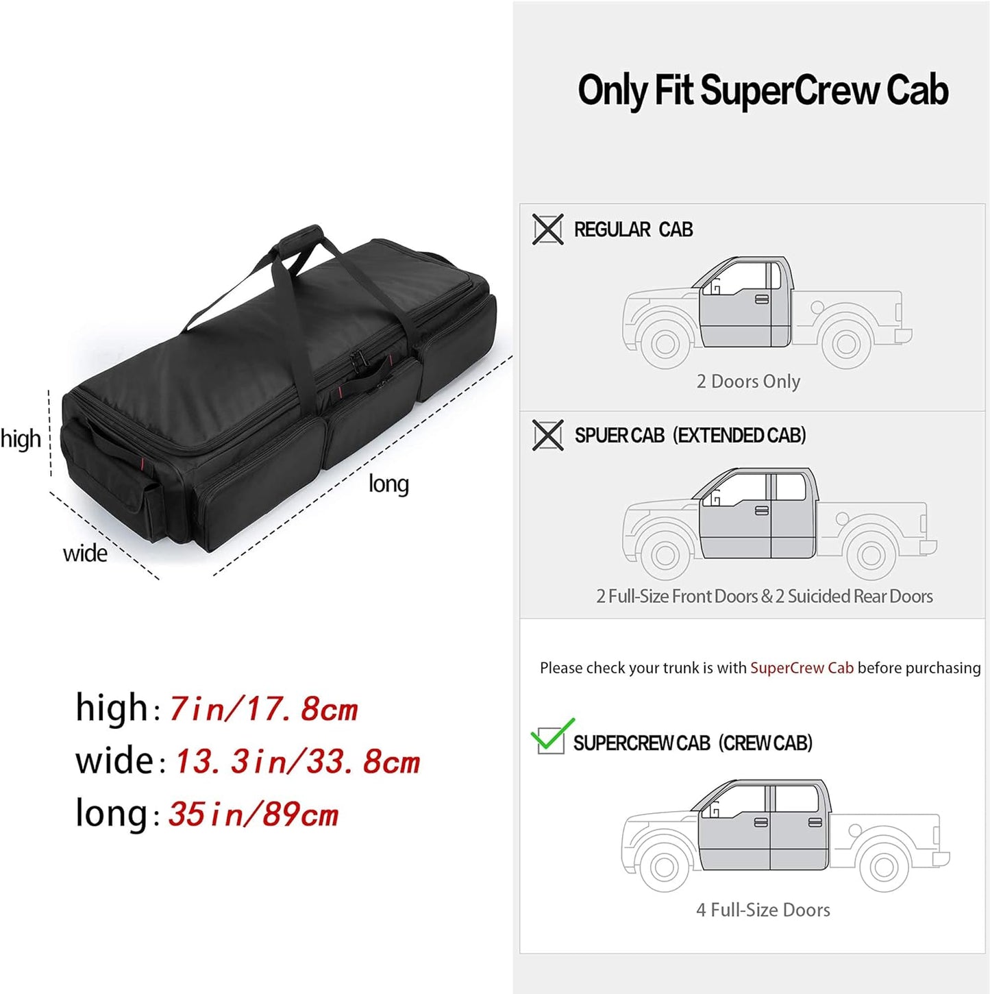- 【Fit For-Dimension】: Product size: 35"*13.3"*7”(The bag length is about 2/3 of the back seat length), fits most full-size truck back seats. Please check your truck is with SuperCrew Cab or Crew Cab (4 full-size doors) and measure the space under the rear seats of your truck before purchasing. Our products are designed to save space, leave your truck uncluttered, and provide convenience for your travel.